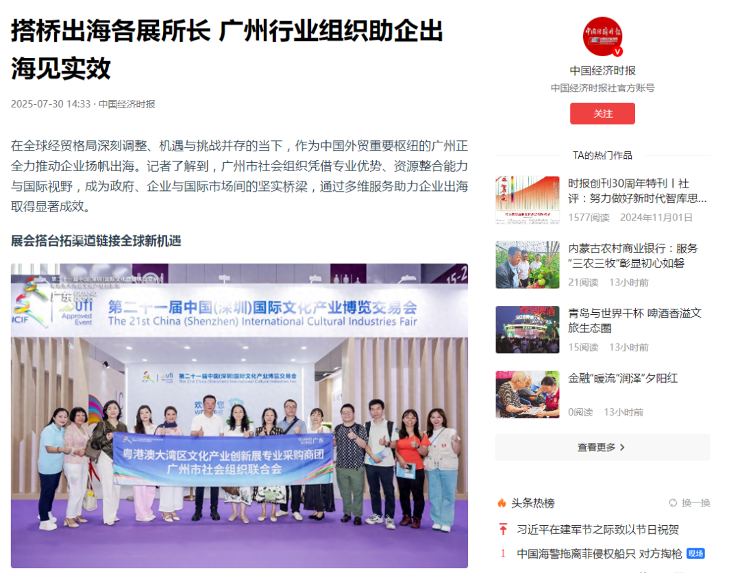 展会是企业出海的重要窗口,广州行业组织精准发力展会经济。广州市社会组织联合会依托“一网六平台”机制,牵头搭建广州社会组织高质量发展综合平台。组织广州社联动员行业协会商会委员会成员赴香港、澳门开展粤港澳大湾区合作与创新发展考察交流行,与香港广东社团总会、澳门工商联会等深度对接,积极融入“一带一路”建设。此外,广州社联联合广州市社会组织文化传播协会组织发动行业代表组团参加第二十一届中国(深圳)国际文化产业博览交易会,并在博览会期间主办“文化+”专题洽谈会,推动文化企业与相关机构之间的实质性合作。