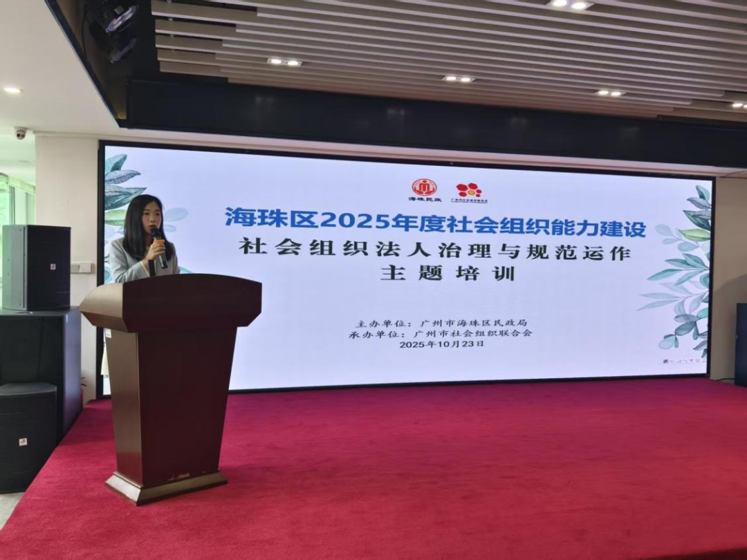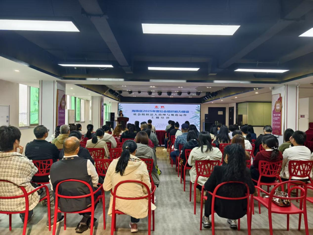 为提升海珠区社会组织的专业化水平与内部治理能力,2025年10月23日下午,由广州市海珠区民政局主办、广州市社会组织联合会(以下简称“广州社联”)承办的海珠区2025年度社会组织能力建设项目——“法人治理与规范运作”专题培训在海珠区素社街党群服务中心顺利举行。本次培训聚焦社会组织规范化运作的实际需求,特邀广州市民政局社会组织登记发展处相关同志担任主讲嘉宾。海珠区民政局党组成员、副局长黄晓葵出席活动并讲话,海珠区民政局社会事务和社会组织管理科四级主任科员刘亦浠出席活动,广州社联常务副秘书长庄秀英主持培训。全区60余家社会组织的相关负责人参与学习。