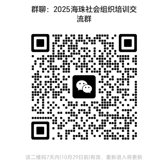 本次培训系2025年度海珠区社会组织能力建设系列活动的首场。下一步,广州社联将持续推出更多专题培训,欢迎各社会组织代表持续关注“广州市社会组织联合会”微信公众号,或扫描下方二维码加入海珠区社会组织培训交流群,及时获取后续活动信息,共同参与学习提升。
