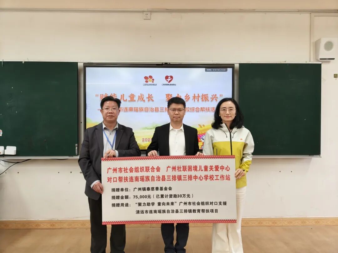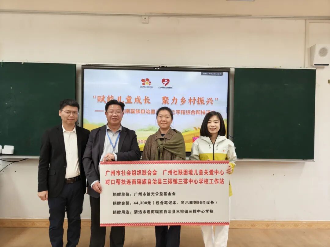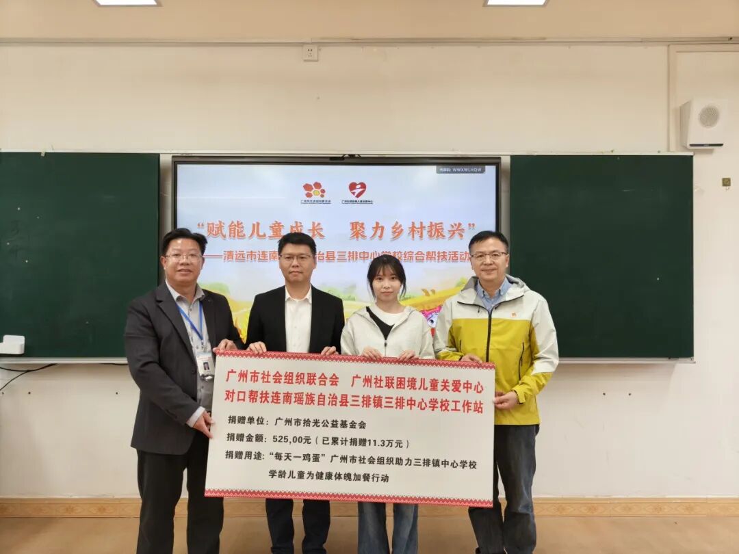 公益助学延续温暖。在三排镇中心学校,考察团开展了精准教育帮扶活动。在广州市社会组织管理局的组织领导下,2022年,广州社联、广州社联困境儿童关爱中心在三排镇开展“聚力助学 童向未来”广州市社会组织对口支援清远市连南瑶族自治县三排镇教育帮扶项目,并选址三排镇中心学校设立对口帮扶工作站,广州社联、广州社联困境儿童关爱中心已连续四年动员50多家社会组织整合有关公益资源支持学校教学和建设。过去的帮扶项目,如“每天一鸡蛋”营养改善计划、“养苗计划”等不断扩大社会影响力,经广州社联的需求对接,仅2025年,广州市拾光公益基金会已累计向“每天一鸡蛋”营养改善计划捐赠了11.3万元,用于改善瑶乡学子营养状况。此次活动,该基金会还向学校捐赠了96台笔记本电脑、显示器等电子设备,改善学校教学条件。