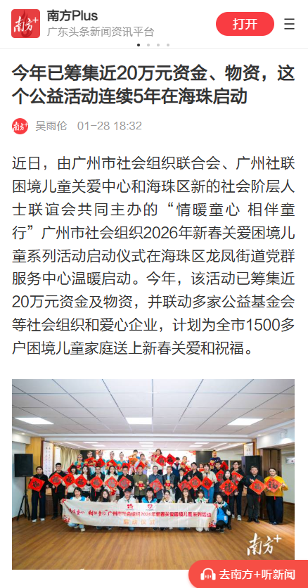 近日,由广州市社会组织联合会、广州社联困境儿童关爱中心和海珠区新的社会阶层人士联谊会共同主办的“情暖童心 相伴童行”广州市社会组织2026年新春关爱困境儿童系列活动启动仪式在海珠区龙凤街道党群服务中心温暖启动。今年,该活动已筹集近20万元资金及物资,并联动多家公益基金会等社会组织和爱心企业,计划为全市1500多户困境儿童家庭送上新春关爱和祝福。