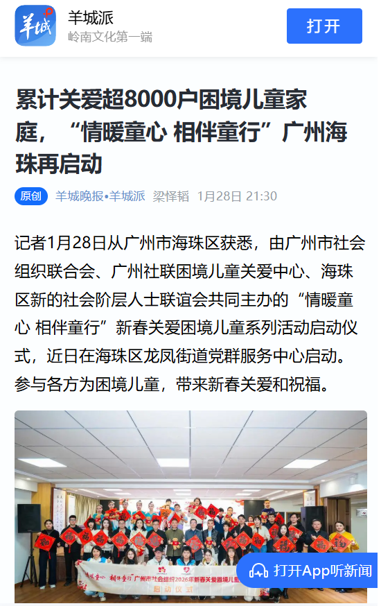 据海珠区新的社会阶层人士联谊会副会长、广州社联困境儿童关爱中心秘书长庄秀英介绍,“情暖童心 相伴童行” 广州市社会组织新春关爱困境儿童系列活动,自2019年启动以来,已连续开展了8年。自2022年起连续5年在海珠区启动,活动已从“单一慰问”发展为广州市社会组织关爱困境儿童的“联合公益”品牌项目。
