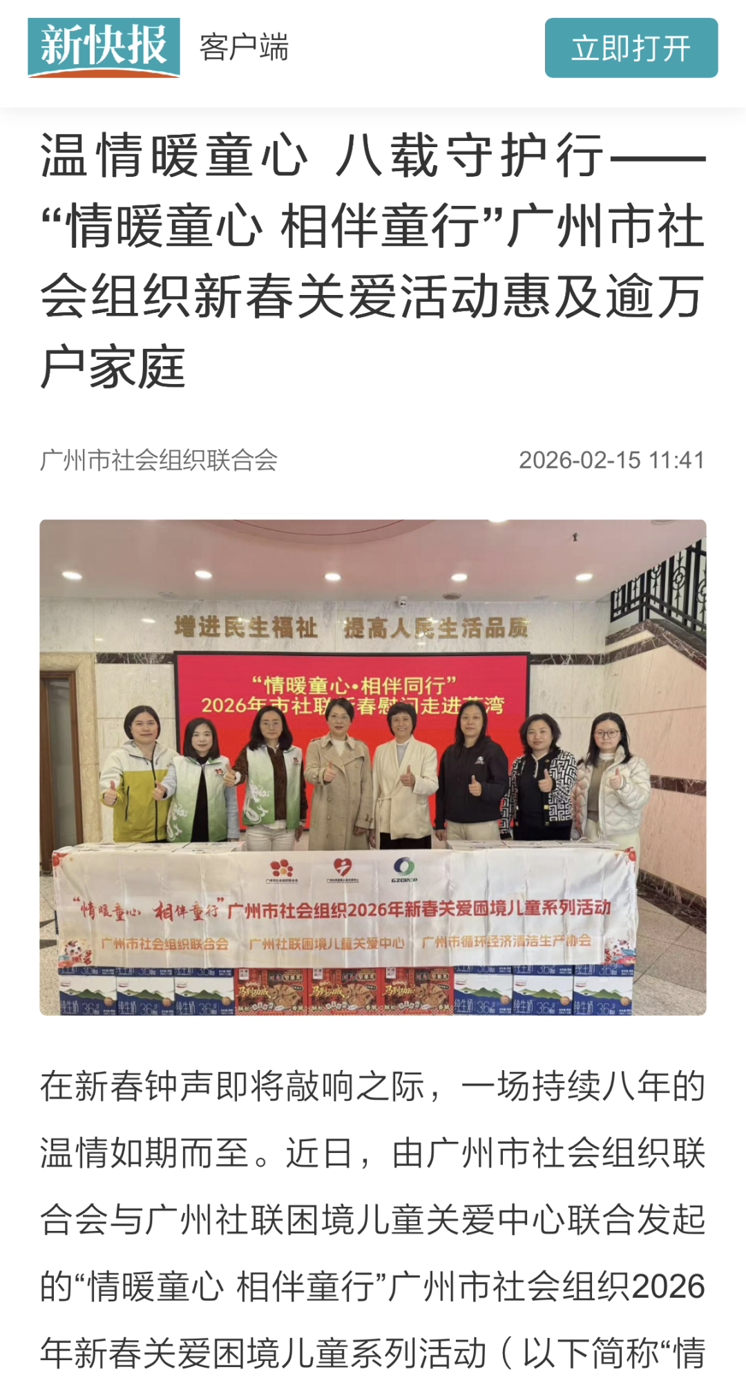 在新春钟声即将敲响之际,一场持续八年的温情如期而至。近日,由广州市社会组织联合会与广州社联困境儿童关爱中心联合发起的“情暖童心 相伴童行”广州市社会组织2026年新春关爱困境儿童系列活动(以下简称“情暖童心 相伴童行”系列活动),再度温暖启程,联动15家社会组织及爱心企业,筹集款物超23万元,走进全市11个区,为1565户困境儿童家庭送上精心准备的节日礼包。